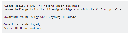 certbot -d bristol3.pki.enigmabridge.com --manual --preferred-challenges dns certonly