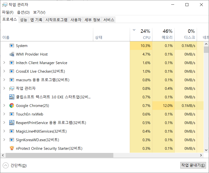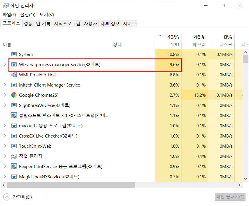 작업관리자 창을 열어서 보니 Wizvera process manager service(32비트)라는 프로세스가.. 약 10%의 CPU점유율을 차지 하고 있었습니다.