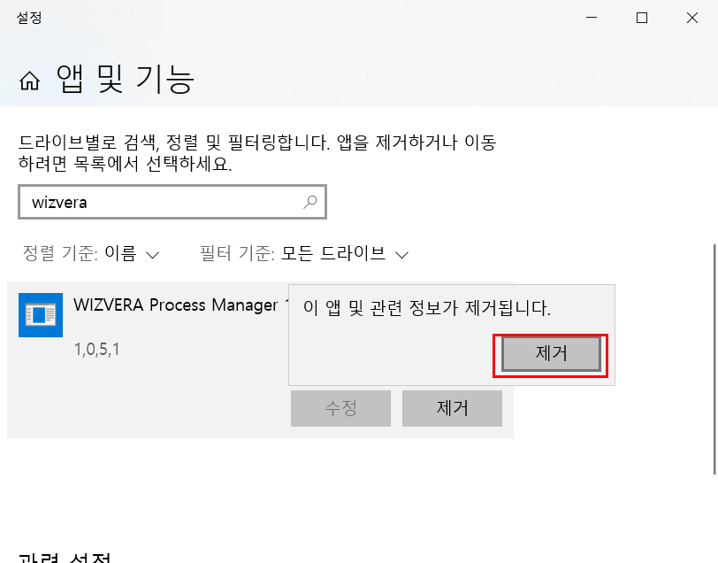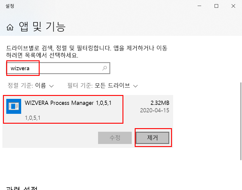 새 창이 뜨면 wizvera를 입력합니다. 그러면 문제의 프로그램이 나옵니다. 프로그램 이름을 클릭 후 제거 버튼을 눌러주세요.