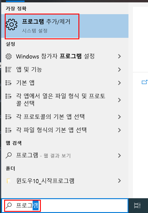 왼도우 좌측 하단의 돋보기 창에 프로그램을 입력하면 위에 프로그램 추가/제거 메뉴가 생깁니다. 클릭해주세요.