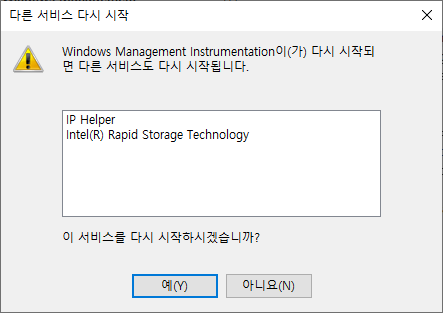 IP Helper와 Intel(R) Rapid Storage Technology 서비스만 재시작해서는 문제가 해결되지 않았습니다. Windows Management Instrumentation을 재시작하니 문제가 해결되네요.