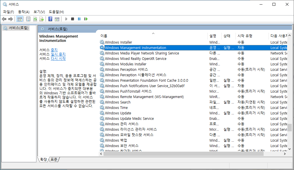일단 WMI Provider Host는 하단의 링크를 참고(서비스 실행 후 Windows Management Instrumentation)하여 서비스에서 Windows Management Instrumentation을 다시 시작하니 점유율이 꽤 낮아졌습니다.
