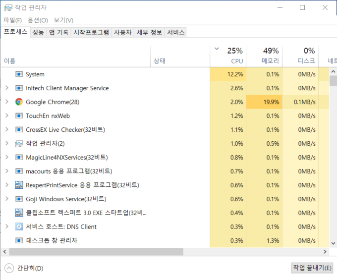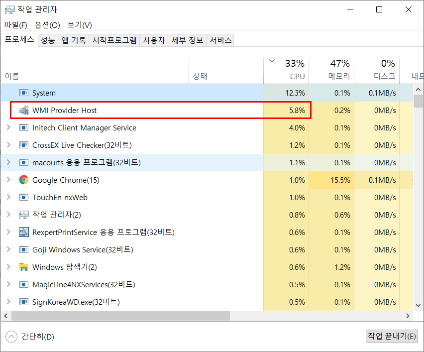 작업관리자에서 보면 System으로 보이는 것과 WMI Provider Host가 점유율이 계속 높네요. 인터넷 검색을 해보니 cpu점유율이 계속 높은 녀석들은 아닌데 좀 이상합니다.