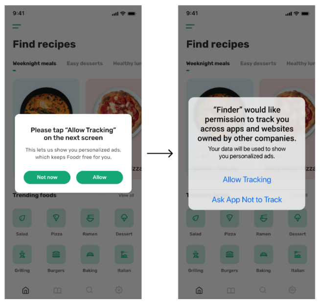 (위 사진에서 오른쪽이 AppTrackingTransparency에서 보여주는 창인데, 이것만으로는 사용자가 무슨 말인지 부족하니 왼쪽의 사진처럼.. 그 전에 사용자에게 정보를 좀 더 알려주라고 권함)