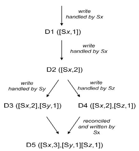 Vector Clock의 개념은 아주 간단합니다. 벡터 클락은 노드(서버)와 count의 쌍을 의미합니다. 바로 위의 예에 적용시켜보면 D1의 경우 벡터 클락은 [Sx, 1], D2의 경우 벡터 클락은 [Sx, 2]가 됩니다.(서버의 이름을 Sx라고 가정함)