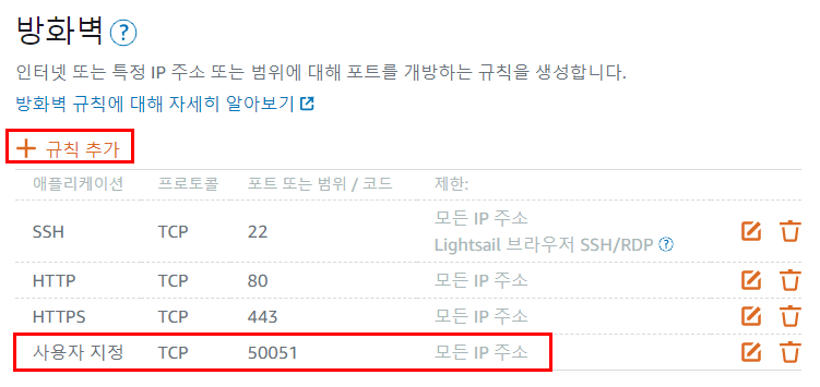 실제로 aws lightsail 콘솔에 로그인해서 확인해보니 22, 80, 443 포트만 열려있더라구요. 규칙 추가 버튼을 눌러서 50051 포트도 열어줬습니다.