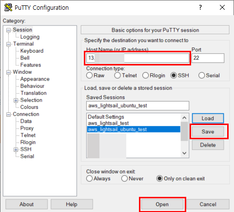 Session으로 돌아와 접속하고자 하는 IP 주소를 입력하고 추후 편리한 사용을 위해 현재까지의 설정을 저장합니다.(Save)
