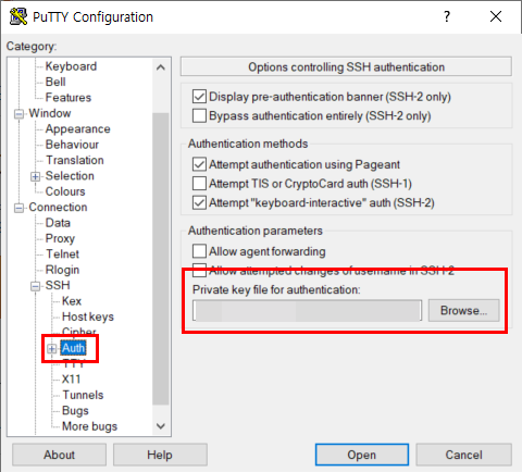 Connection > SSH > Auth의 Private key file for authentication에 개인키 경로를 지정해줍니다.
