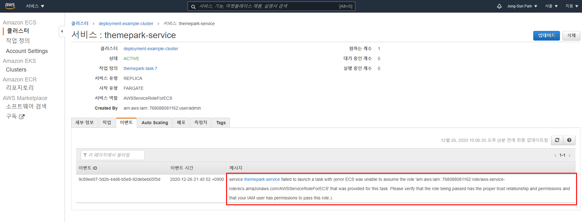 근데 에러가 발생하네요.(이미 AWSServiceRoleForECS라는 이름의 Service role이 있어서 에러가 발생했다는 내용임)