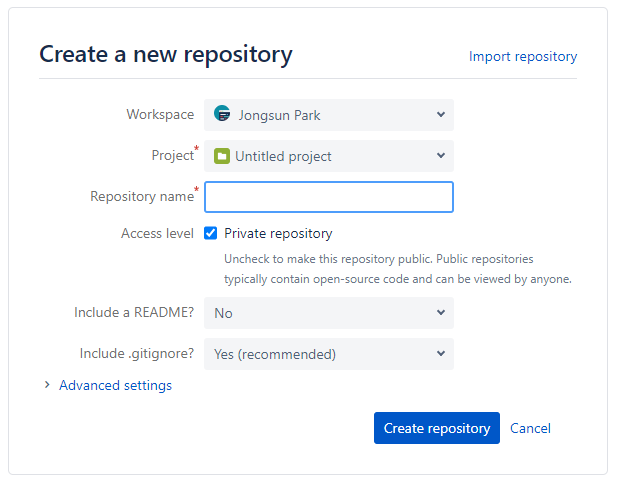 3. Bitbucket 홈페이지에 로그인한 뒤 repository를 생성합니다.