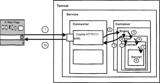 1. The user clicks on the content of the web page, and the request is sent to port 8080 of the local machine, which is obtained by the Coyote HTTP/1.1 Connector that is monitoring there.