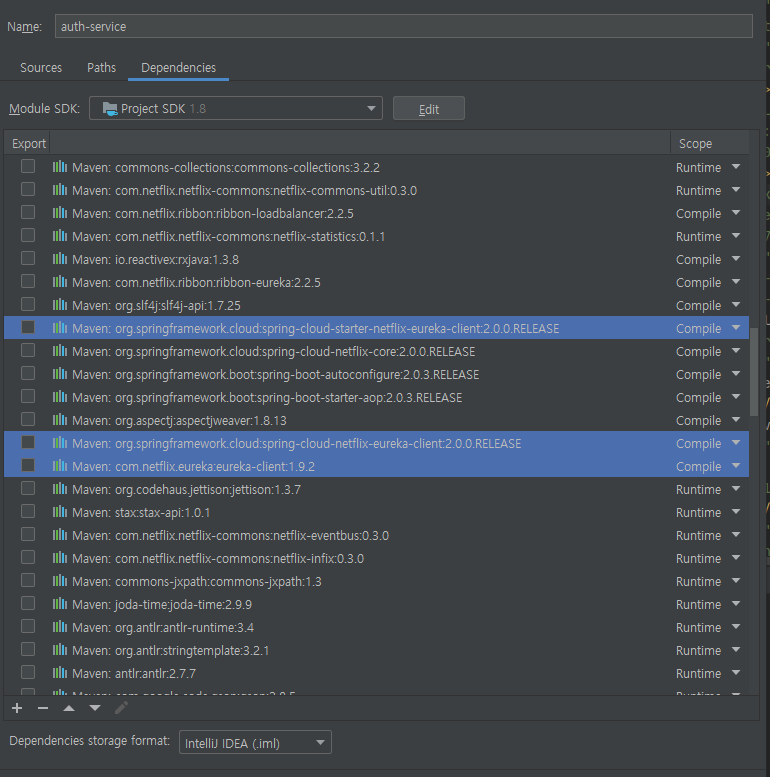 pom파일에서 디펜던시를 추가하면 관련 모듈들이 iml파일에도 추가됩니다. (앱 실행시 변경되는 듯)
