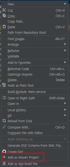 IntelliJ에서 pom.xml 파일을 오른쪽 마우스로 클릭하면 나오는 메뉴 중에 하단에 있는.. Add as Maven Project 메뉴를 선택하면 됨
