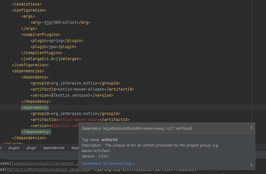 [스프링][코틀린][Maven] Dependency 'org.jetbrains.kotlin:kotlin-maven-noarg:1.4.31' not found