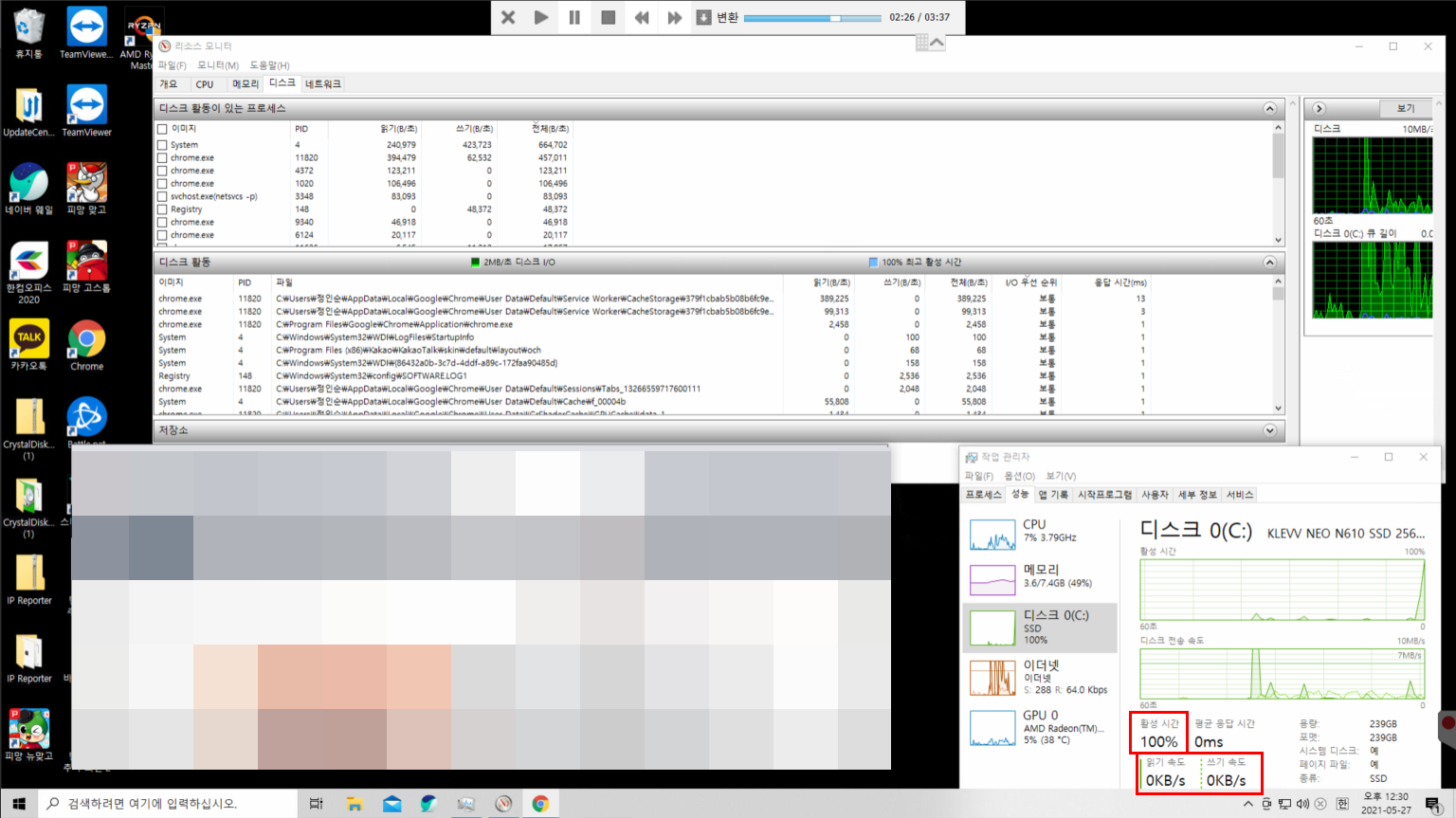 오히려.. 디스크 점유율은 100%가 되는데 읽기 속도, 쓰기 속도는 0KB/s로 내려갔습니다.