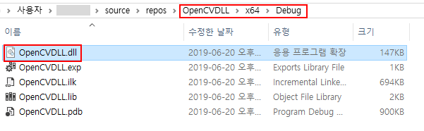 생성된 파일은 프로젝트 폴더의 x64\Debug 폴더에 있습니다. OpenCVDLL.dll이라는 파일이 생성됐습니다. 이 파일과 이 dll에서 호출하는 것과 관련된 OpenCV dll파일을 유니티에 복사할 예정입니다.