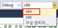 유니티에서 외부 DLL을 쓰려면 64비트로 만들어진 DLL만 쓸 수 있습니다. 그렇기에 비주얼 스튜디오에서 x86이 아닌 x64를 선택하도록 합니다.
