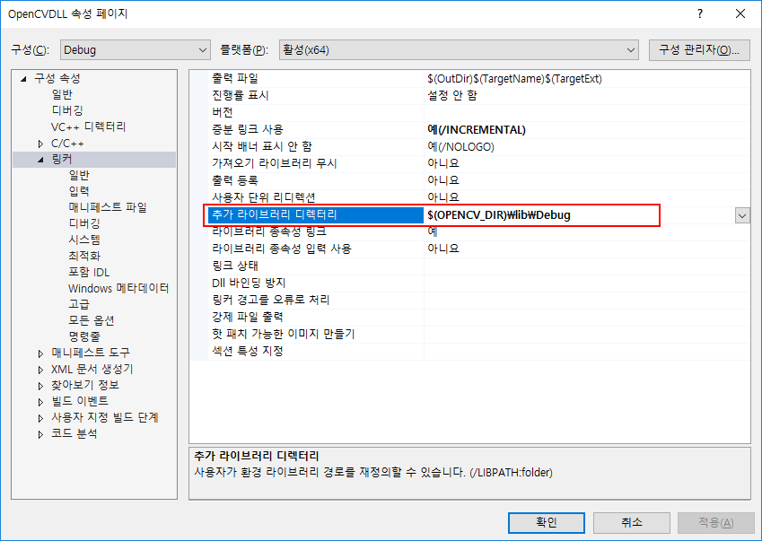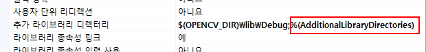 정상적인 경우라면 위 사진처럼 %(AdditionalLibraryDirectories)가 있어야 합니다.