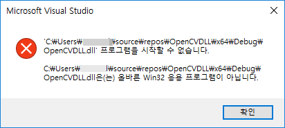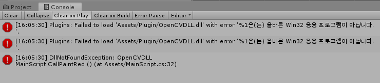 Plugins: Failed to load 'Assets/Plugin/OpenCVDLL.dll' with error '%1은(는) 올바른 Win32 응용 프로그램이 아닙니다.