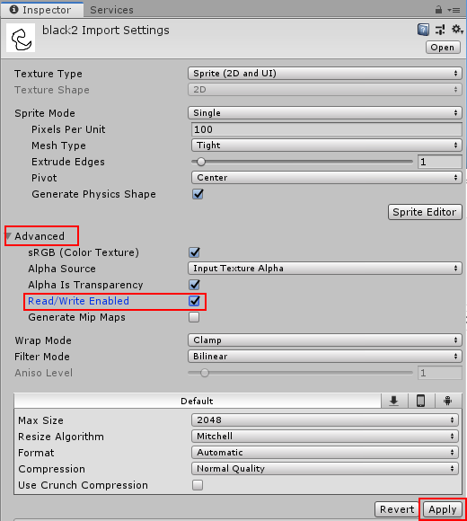 추가된 black2파일을 클릭하면 Import Settings를 볼 수 있습니다. Advanced를 열어서 보면 Read/Write Enabled 옵션이 있습니다. 기본적으로는 체크가 되어있지 않습니다. 이 부분을 클릭하여 체크해줍니다. 그래야 이 유니티에서 이 파일 수정이 가능합니다. 수정 후 Apply 버튼을 클릭해주세요.