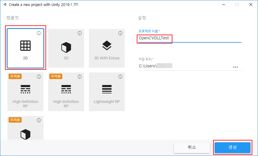 유니티에서 적당한 프로젝트를 만들어주세요. 저는 프로젝트 이름을 OpenCVDLLTest라고 지었습니다.