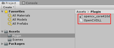 유니티에서 Assets 폴더 밑에 Plugin 폴더를 만들었습니다. 이 폴더에 opencv_core410d.dll파일과 OpenCVDLL.dll 파일을 드래그해서 복사했습니다.