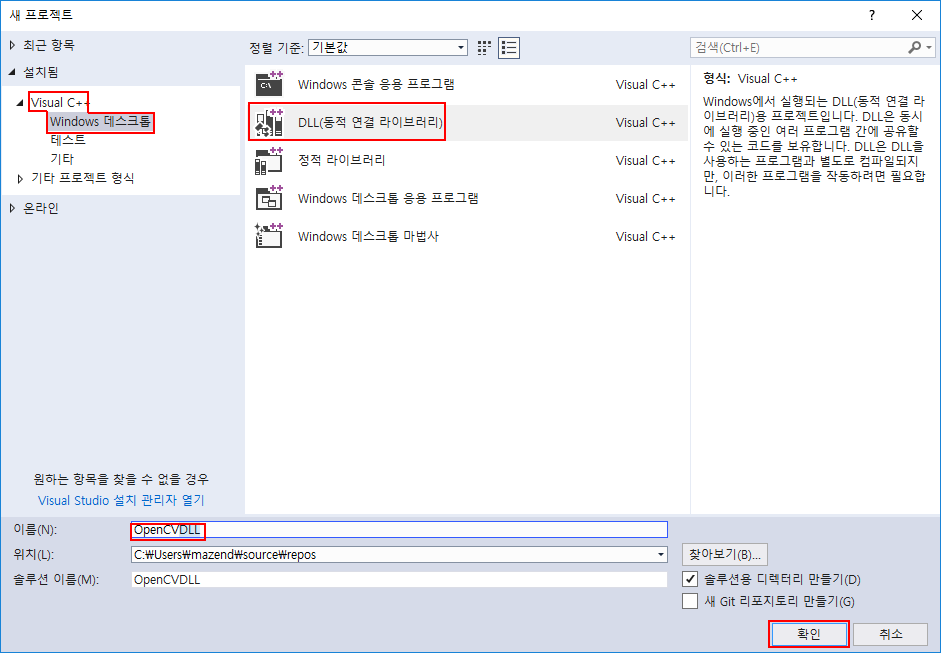 비주얼 스튜디오에서 새 프로젝트를 만들어야합니다. 무료 버젼인 커뮤니티(Community) 버전에서 DLL 프로젝트가 안만들어지면 어쩌나 걱정했는데 만들 수 있습니다. 위 사진과 같이 DLL(동적 연결 라이브러리)를 선택해주세요. 프로젝트 이름은 적당히 하시면 됩니다. 저는 OpenCVDLL이라고 했습니다.
