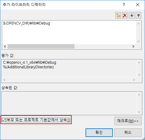 추가 라이브러리 디렉터리 수정 창을 띄워 부모 또는 프로젝트 기본값에서 상속에 체크를 해주면 문제가 해결됩니다.