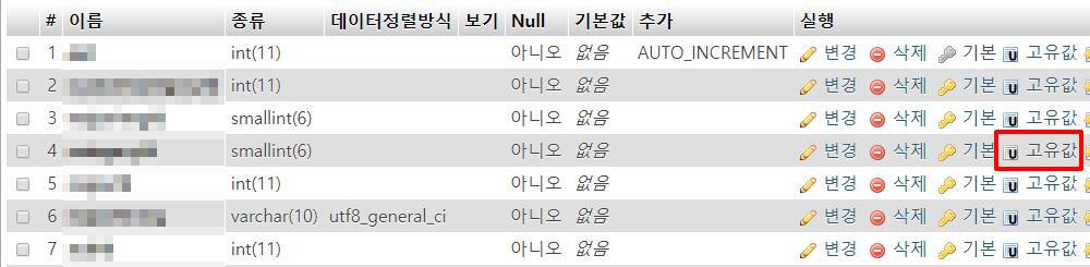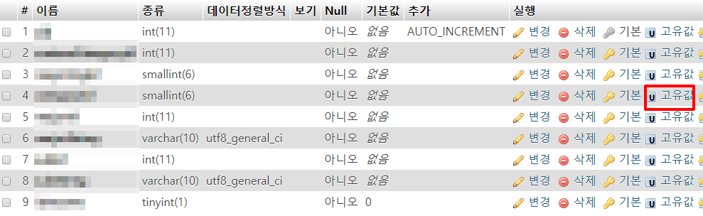 phpMyAdmin에 로그인해서 테이블의 구조를 보면 위 사진과 같은 화면을 볼 수 있습니다. 그 중에서 고유값이 설정된 column은 위 사진에서 빨간색 네모로 표시한 것처럼.. 고유값 부분이 회색으로 되어 있습니다.