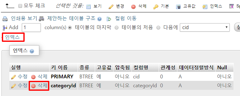 여기에서.. 고유값 설정을 해제한 column을 삭제하면 됩니다. 저의 경우엔 categoryId였습니다.
