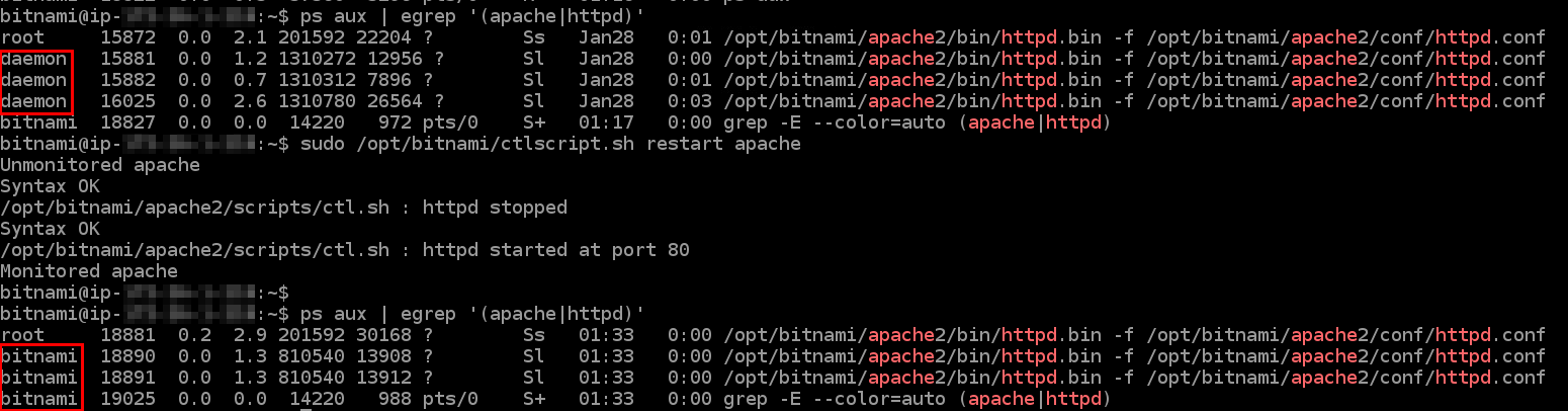 음.. 그런데 위에서 User daemon을 User bitnami로 변경하고 서버 재시작을 해봤습니다.