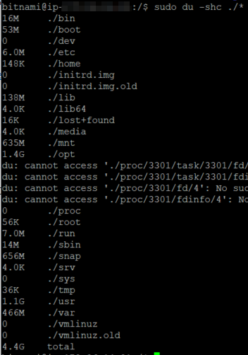16M ./bin 53M ./boot 0 ./dev 6.0M ./etc 148K ./home 0 ./initrd.img 0 ./initrd.img.old 138M ./lib 4.0K ./lib64 16K ./lost+found 4.0K ./media 635M ./mnt 1.4G ./opt 0 ./proc 56K ./root 7.0M ./run 14M ./sbin 656M ./snap 4.0K ./srv 0 ./sys 36K ./tmp 1.1G ./usr 466M ./var 0 ./vmlinuz 0 ./vmlinuz.old 4.4G total |