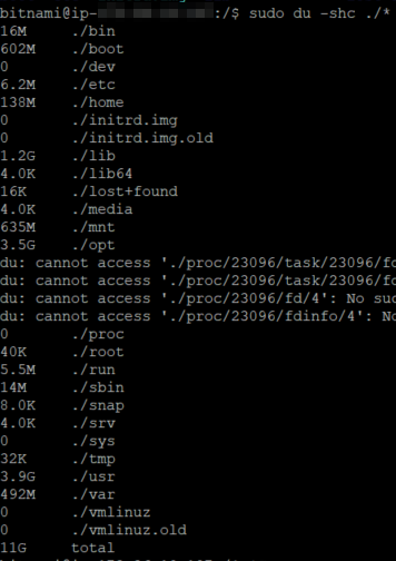 | 16M ./bin 602M ./boot 0 ./dev 6.2M ./etc 138M ./home 0 ./initrd.img 0 ./initrd.img.old 1.2G ./lib 4.0K ./lib64 16K ./lost+found 4.0K ./media 635M ./mnt 3.5G ./opt 0 ./proc 40K ./root 5.5M ./run 14M ./sbin 8.0K ./snap 4.0K ./srv 0 ./sys 32K ./tmp 3.9G ./usr 492M ./var 0 ./vmlinuz 0 ./vmlinuz.old 11G total |